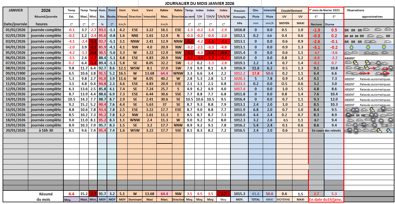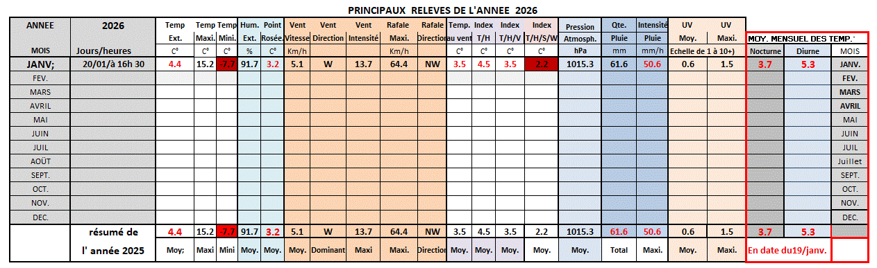 Prochaine mise à jour complète: . - Les relevés du mois de janvier seront aléatoires pour cause des séjours en clinique de l’auteur - Désolé ….. Les relevés seront enregistrés automatiquement mais divulgués sans doute avec du retard. .Prochaine mise à jour : mercredien cours de soirée. |