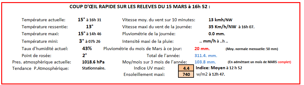 Cette nuit: . Pluies pouvant être intenses . En matinée: .Matinée pluvieuse suivie d’éclaircies. L’après-midi: Eclaircies. En soirée: Eclaircies avec quelques rafales de vent. La nuit prochaine: Nuageux devenant clair. Températures: Maxi: 11° - Minimum:5° ( 2° dimanche au lever du jour)