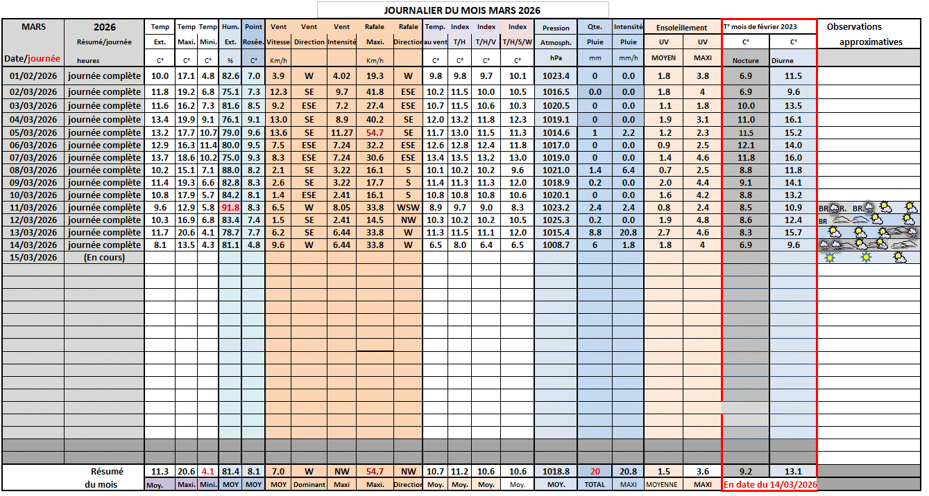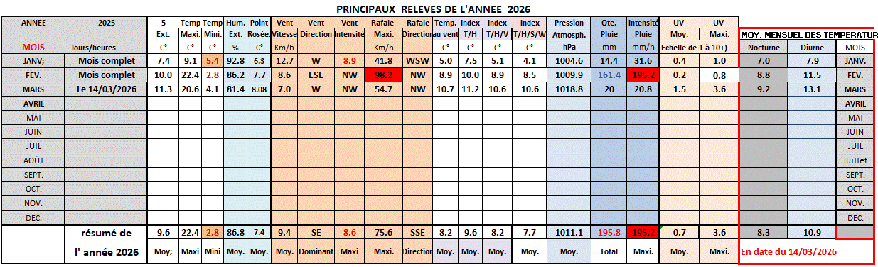 Dates- Temp - Moyenne- Températ- Minimum - Heure - Pluie- Vent- Vent maxi- Heure - Direction |